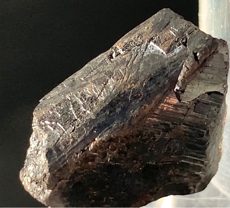 Mostly black tantalo/wodginite, containing semi-transparent red and gold-coloured elements and some interesting con-centric trapezoid crystallizations. The striated textures may be pinacoid in origin.